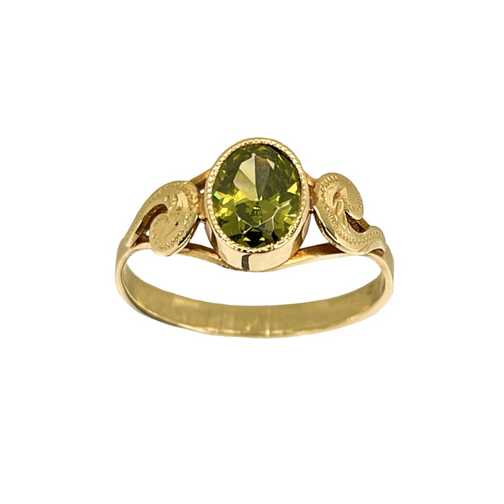 Zlatý prsteň gravírovaný so zeleným zirkónom